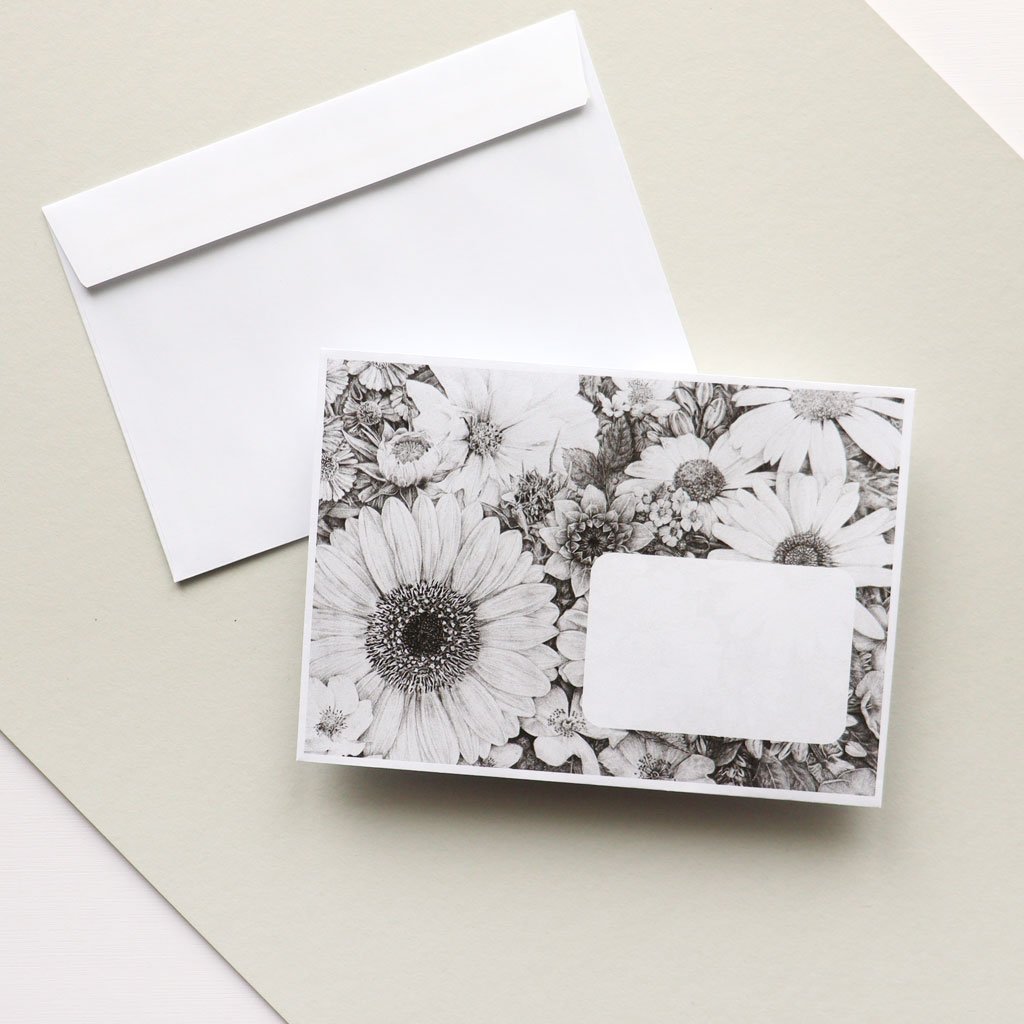 - bílá běžná C6 (162 x 114 mm) obálka s ČB květinovým potiskem (kresba)