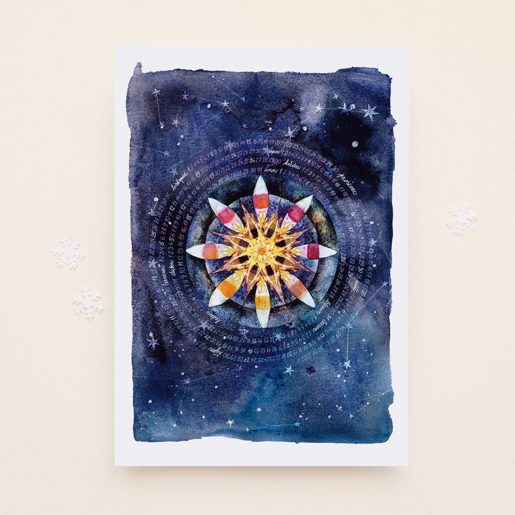 - kolem mandaly jsou vepsány všechny měsíce a dny roku 2026, neděle jsou zvýrazněné, kalendárium, ačkoli fakticky správné, neslouží primárně k orientaci v datech, je to hlavně zdobný prvek a místy není úplně zřetelné